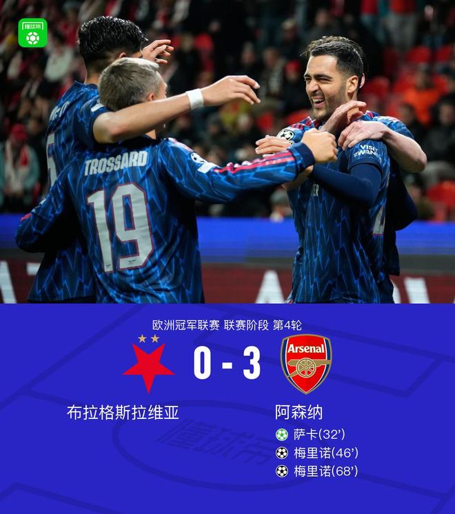 北京时间11月5日凌晨1点45分,欧冠联赛第四轮,阿森纳做客对阵布拉格斯拉维亚。裁判是阿加耶夫。萨卡上半场就进球了。下半场,美利奴连续两局拿下两分。最终,阿森纳3-0战胜布拉格斯拉维亚。重要赛事第32分钟,普罗沃德手球,萨卡射门破门,阿森纳1-0获胜。第46分钟,特罗萨德传球,无人盯防的梅里诺轻松破门,阿森纳2-0!第68分钟,梅里诺凭借马尔科维奇的低级失误梅开二度,阿森纳3-0!第20分钟,两队球员入场,比赛即将开始。加布里埃尔外线抽射,皮球擦着立柱。第18分钟,加布里埃尔出现受伤,接受了队医的治疗。第20分钟,萨卡突然射门被扑出。第22分钟,恩瓦内里犯规吃到黄牌。实际犯规。第24分钟,萨卡突破防守突入禁区射门。 ,球被挡住了。第37分钟,梅里诺铲球吃到黄牌。第45分钟和第4分钟,托马斯·萨奥利向裁判抗议并与因卡皮相撞。第66分钟,拉亚传球,被对手铲断挡出。本怀特在第86分钟获得点球。裁判看了VAR后取消了判罚【查看米格独家英超技术统计】