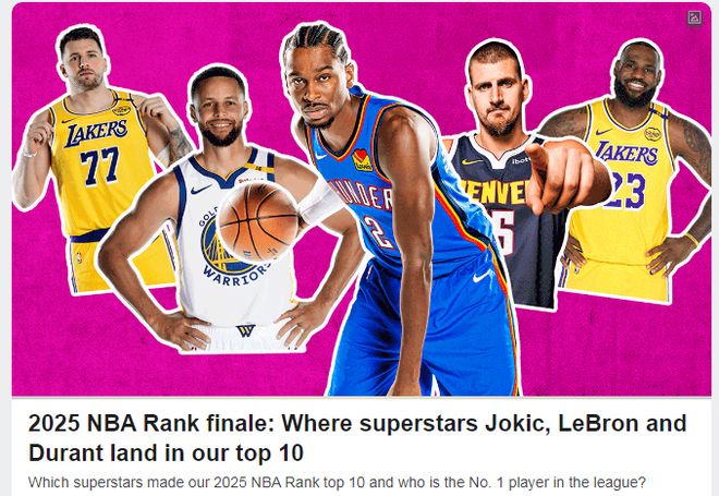 9月25日,北京时间,美国媒体ESPN宣布了新赛季的100名最佳球员中的10个最佳球员。 Jokic再次占据了第一名,亚历山大和唐西奇分别占据了第二和第三名,而Wenban Yama占据了第五名,Curry,James和Durant分别分别为7-9。 ESPN宣布了新赛季的10名最佳球员:1。Jokic2,Alexander 3,Doncic 4,Antetokounmpo 5,Wenbanyama 6,Edwards 7,Curry 7,Curry 8,James 9,Durant 10和Brunson Jokic有望带领Pepitas赔偿新赛季的冠军。毕竟,在许多公司之后,团队的一般力量得到了显着改善。上赛季FMVP和MVP冠军亚历山大在Jokic中排名第二。亚历山大是新一代的主要角色之一。预计今年夏天将以他最大的薪水续签与雷霆队的合同,今年夏天赢得了两次后果冠军冠军,但在欧洲冠军还不错N杯,这使他占据了名单中的第三名,并且乐观地将湖人带入冠军。至于Antetokounmpo,他在Wenbanyama排名第四和第五。他也很乐观,他将成为新一代的主要人物之一。爱德华兹(Edwards)排名第六,超过了三位资深明星,库里(Curry),詹姆斯(James)和杜兰特(Durant)。令人惊讶的是,张·杜克(Jang duk)仍位居前10名,布兰森(Branson)的核心位居第十。 90 remaining on the attached list: Barrett Castle Kessl Pritchard Alexander Walker PJ Washington Wise Celper Ter Mitchell Robinson Ju Holiday 90-81: Nazraid Wiggins Zack Idla Baranville Avetobias Levli Laven Kobe White 70-61: VES SAGES MURPHY III MILES MILES TURN Jarrett Allen 44, Jaren Johnson 43, Markanen 42, Randall 41, Anunobi 40, Aron Gordon 39, Bain 38, Garland 37, Amen Thompson 36, Zubac 35, Fox 34, Sa 33, Morant 32, Wagner 31, Jaren30, Scotty Barnes 29, Max, Max, Mata through 26, Maxi 26, Maxi 26, Demer Shinkin 24, HomegrEN 23,Harden 22,Siakam 21,Adebayo 20,Leonard 19,Jaylen Brown 18,Butler 17,Ban Keiro 16,Booker 15,Mitchell 15,Mitchell 14,Brows Dark 13,Mobley 13,Mobley 12,Cunningham 11 Jaylen Williams Williams Williams Williams Williams Williams Williams Williams Williams Williams Williams
